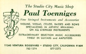 of Paul Toenniges, born in De Kalb, Paul ran a simple family-owned and operated business along with his wife, Ruth, and two daughters, Nancy and Jane. Nancy Toenniges showed a decided talent in restoration at an early age and it was decided that she should attend the Violinmaking School in Mittenwald, Germany to further her education. While in Mittenwald, Nancy met her future husband, Hans Benning, also a student in the violinmaking school. Together they returned to Studio City Music in 1964 to continue the legacy of their shop. Hans Benning continued his studies, working for a time with Carl Becker Sr. in Wisconsin and with others in the California area, such as Raymond Del Prado and Frank Kovanda. Eventually, in 1978, Hans and Nancy Benning took over Studio City Music when Paul retired. The longevity of Studio City Music seems very much intact now that Hans' and Nancy's son, Eric Benning, has come to work for them and intends on running the shop for the third generation.